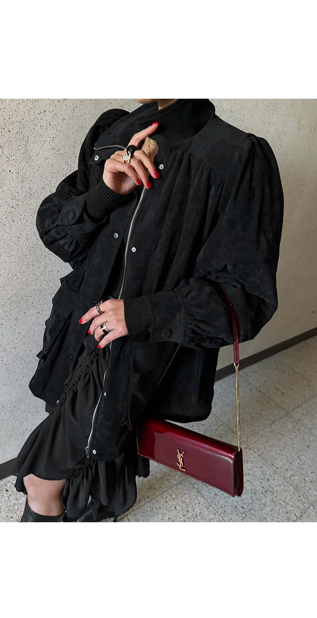 어깨는 자연스럽게 볼륨을 살린 퍼프 라인,