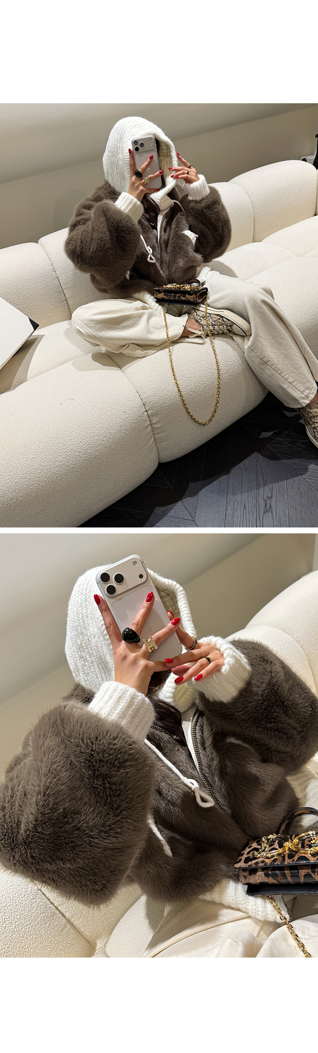 포근한 퍼 텍스처와 캐주얼한 후드 디자인이 만나