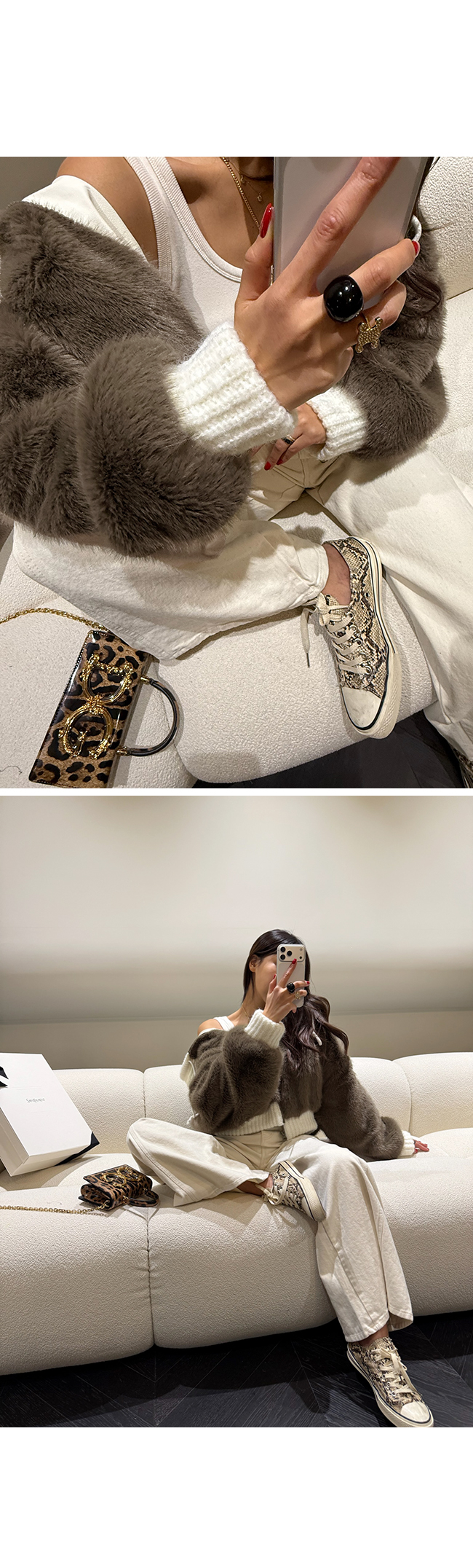 퍼와 니트 소재의 조합이 과하지 않으면서도 감각적인 스타일을 완성해줘요.