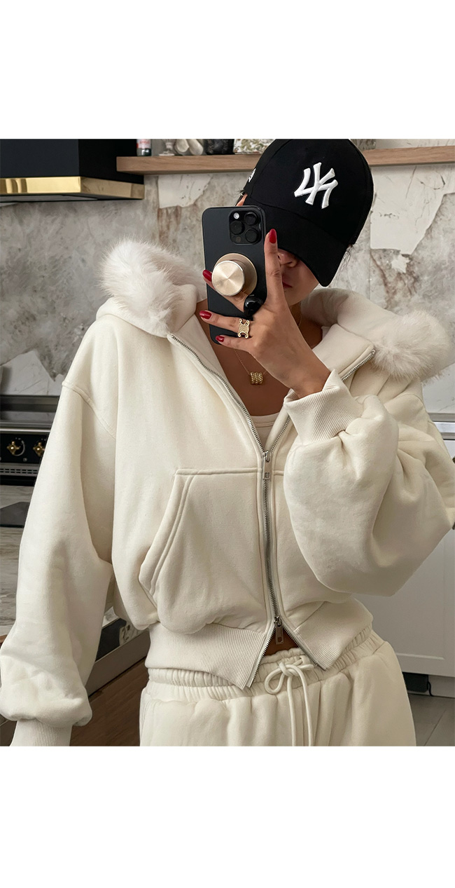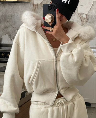 후드 라인에는 풍성한 퍼 트리밍이 더해져