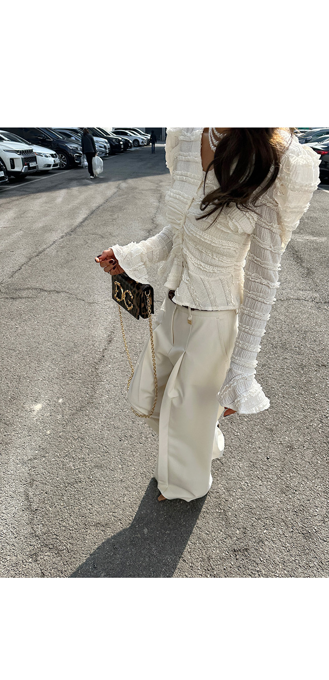 숄더에 더해진 퍼프 디테일이 얼굴선을 더욱 작아 보이게 해주고