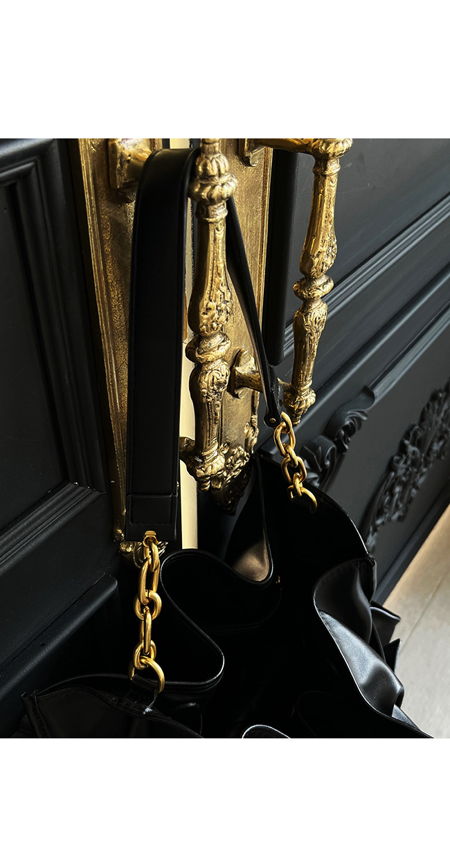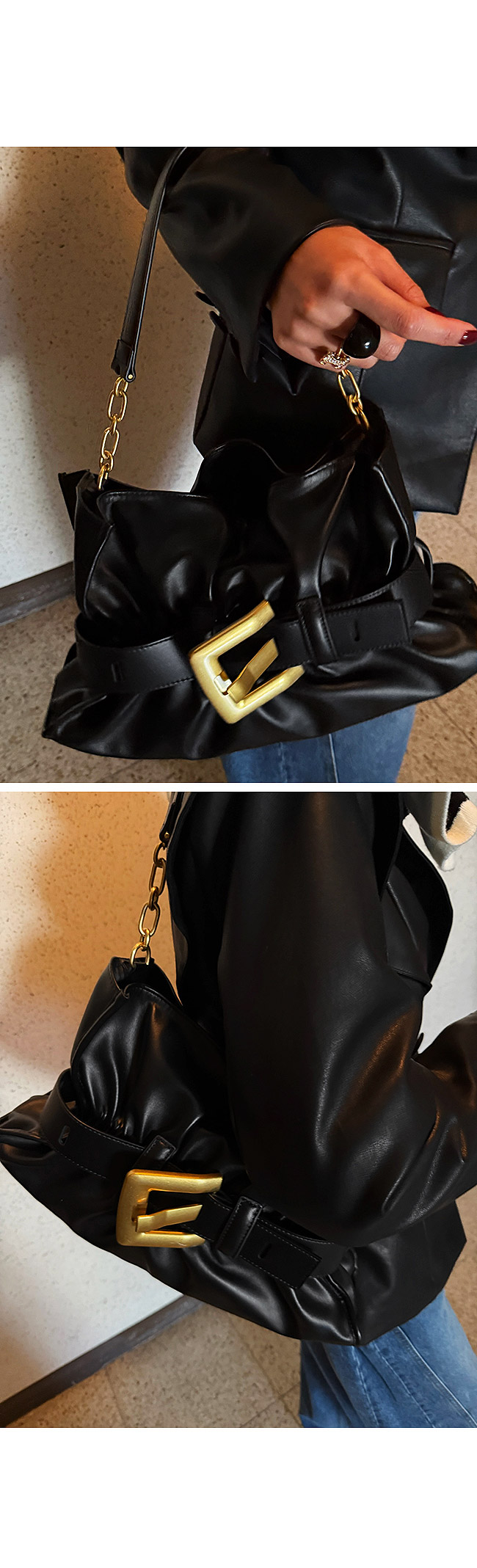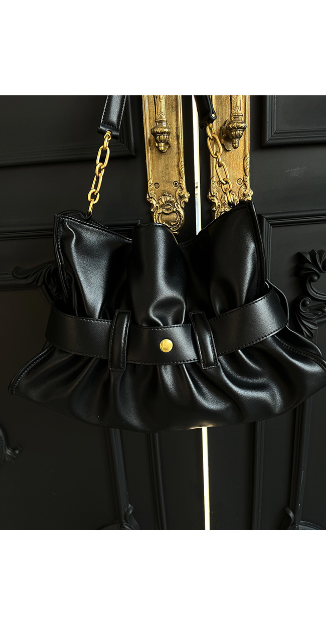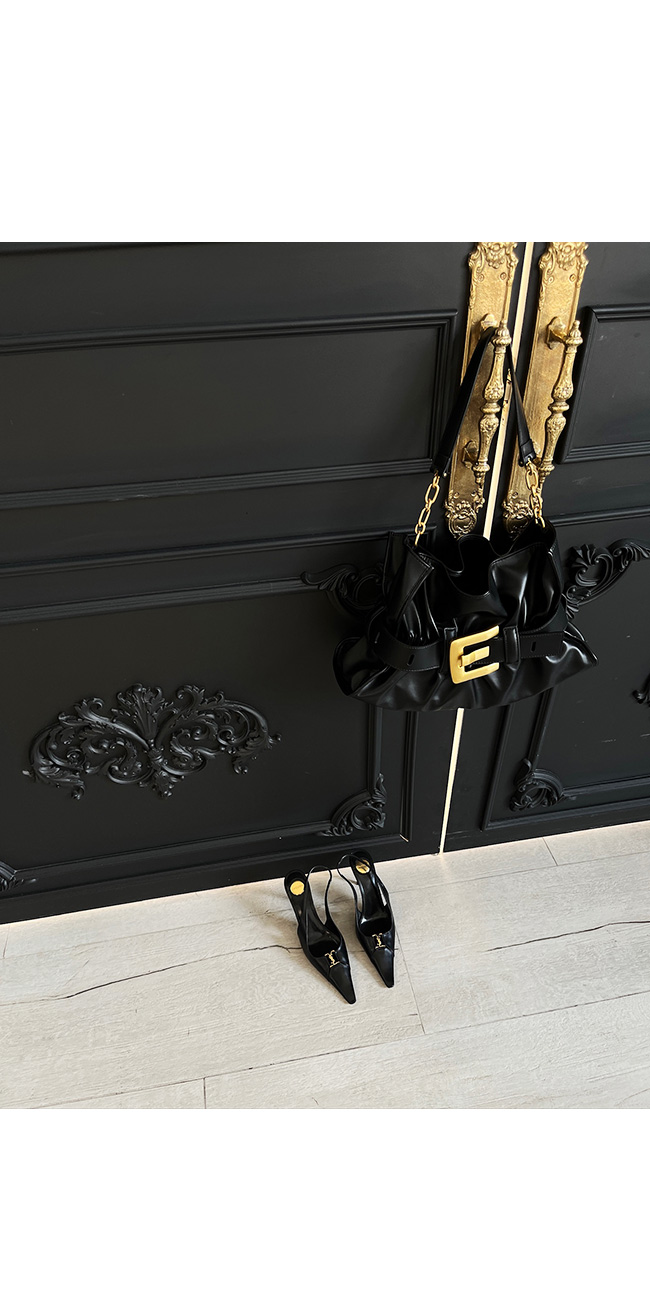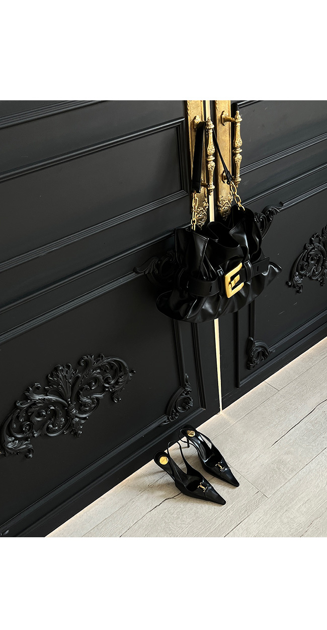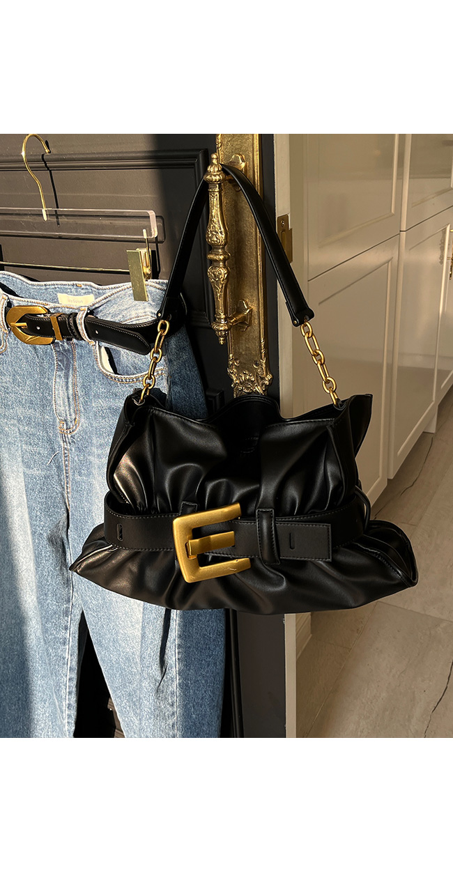 - 자연스러운 셔링 실루엣과 볼드한 골드 버클 디테일