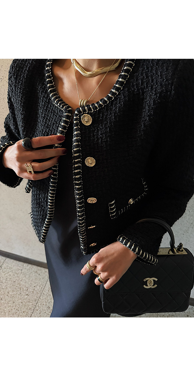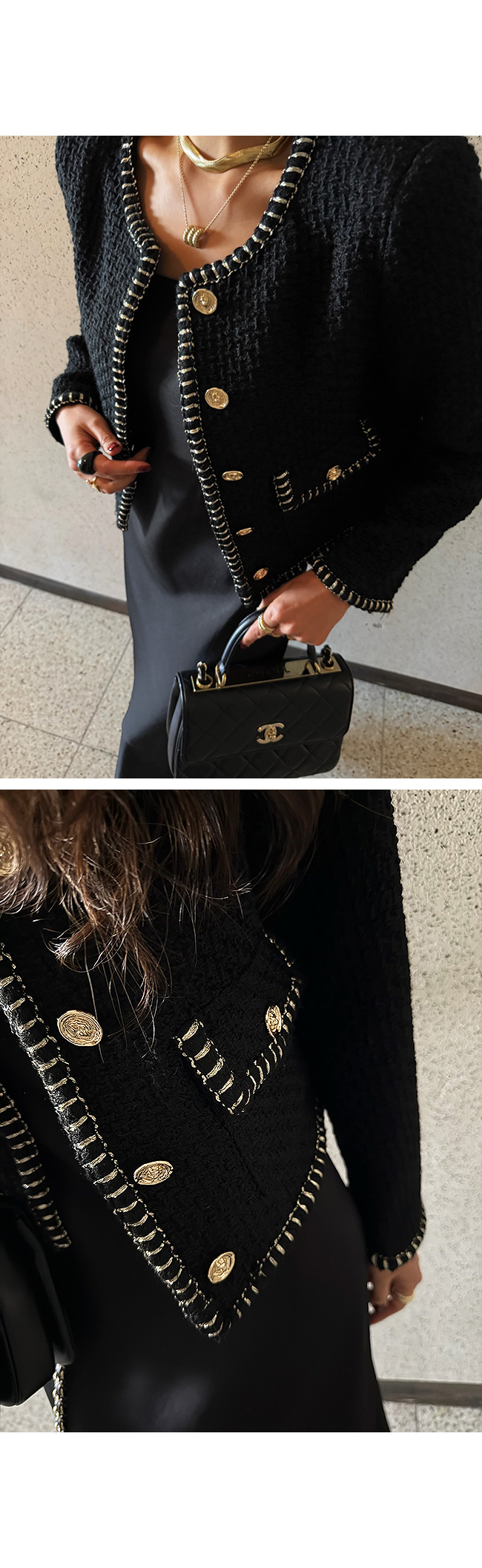 넥라인과 소매, 포켓 라인에는 골드 트리밍 디테일을 더해