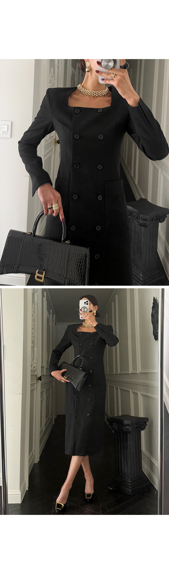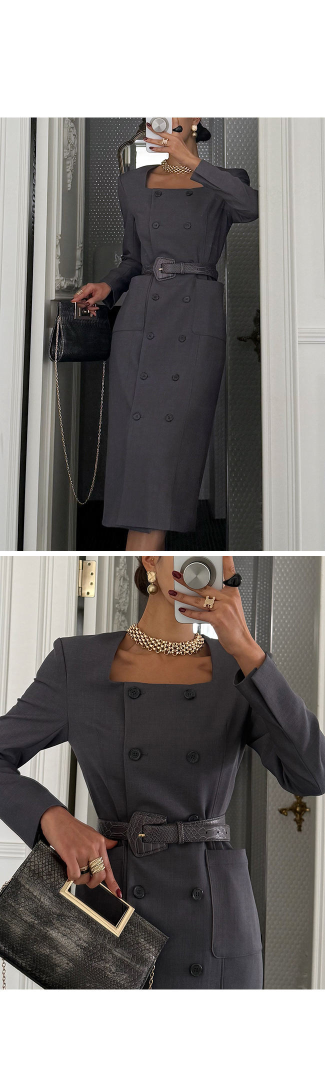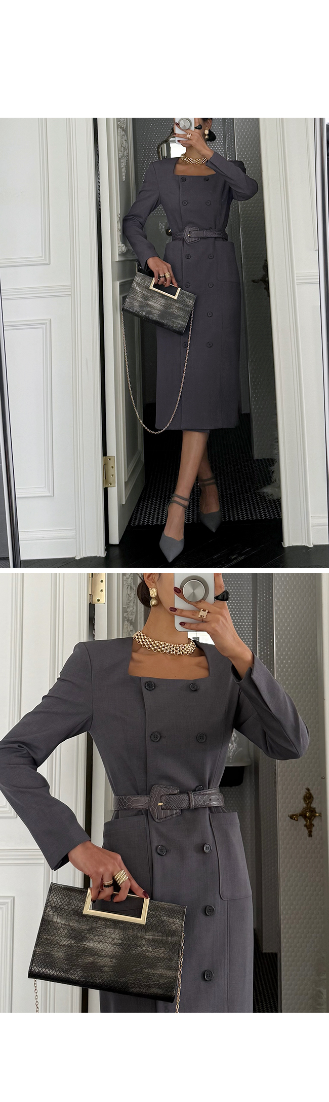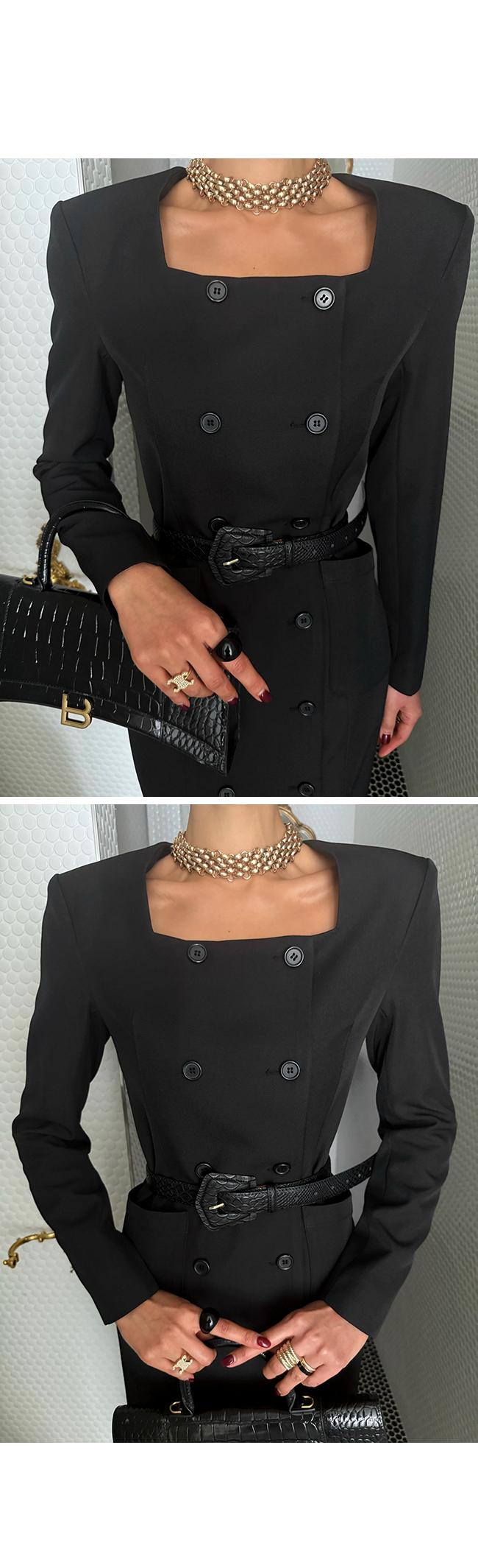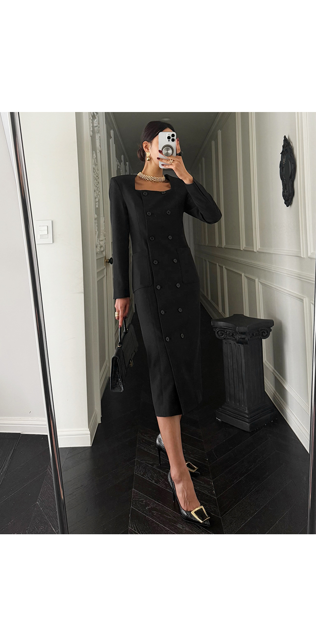 깔끔한 스퀘어 넥 라인과 더블 버튼 디테일이