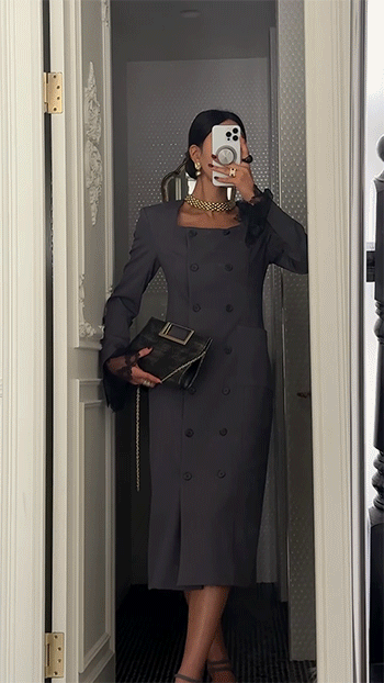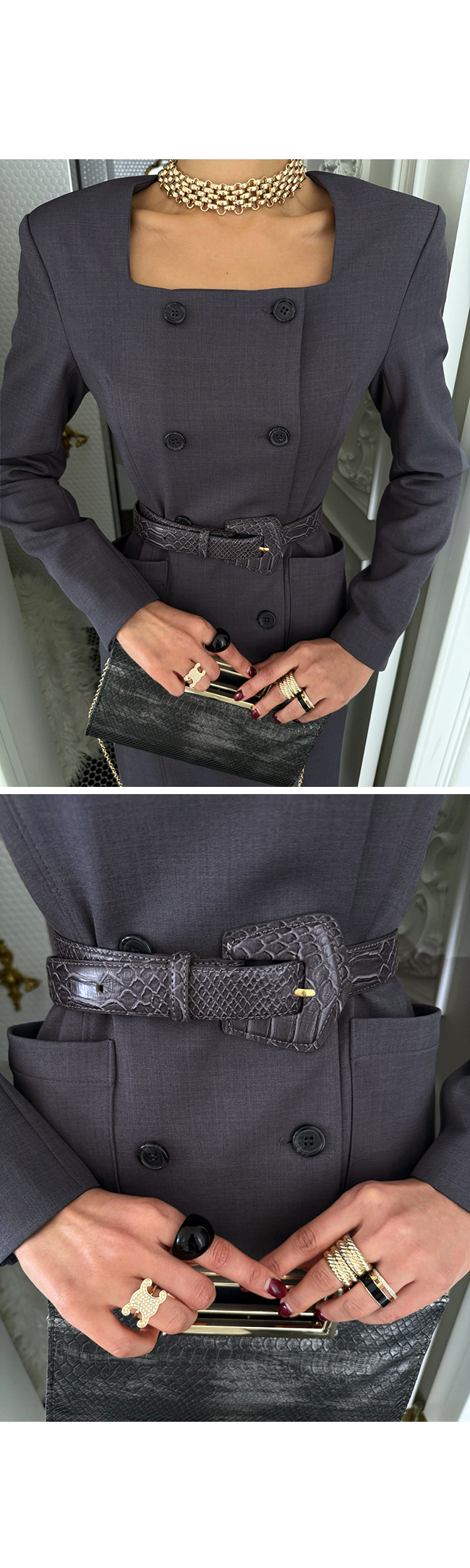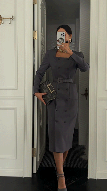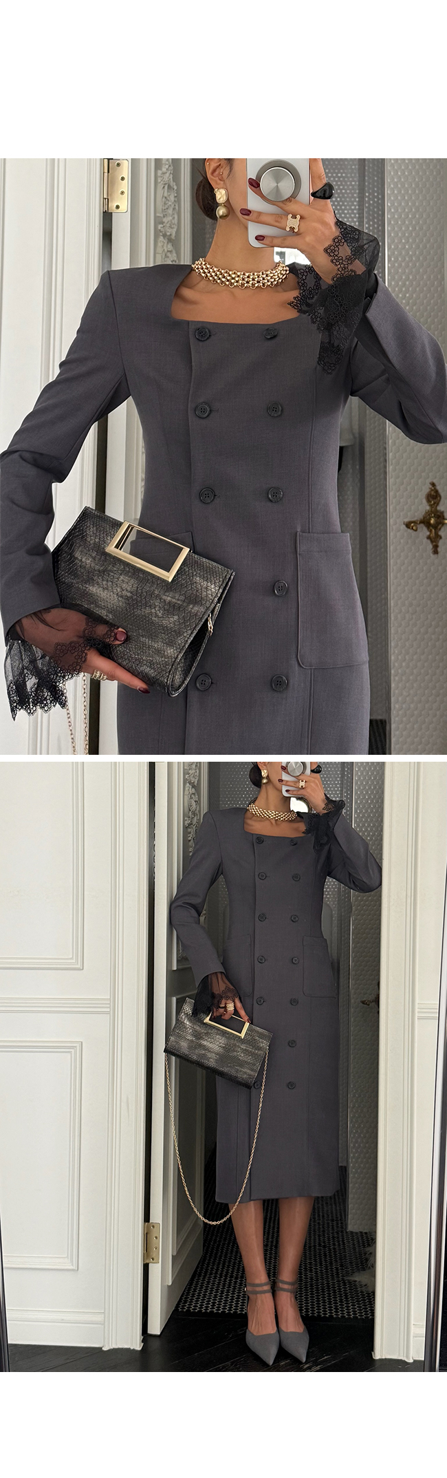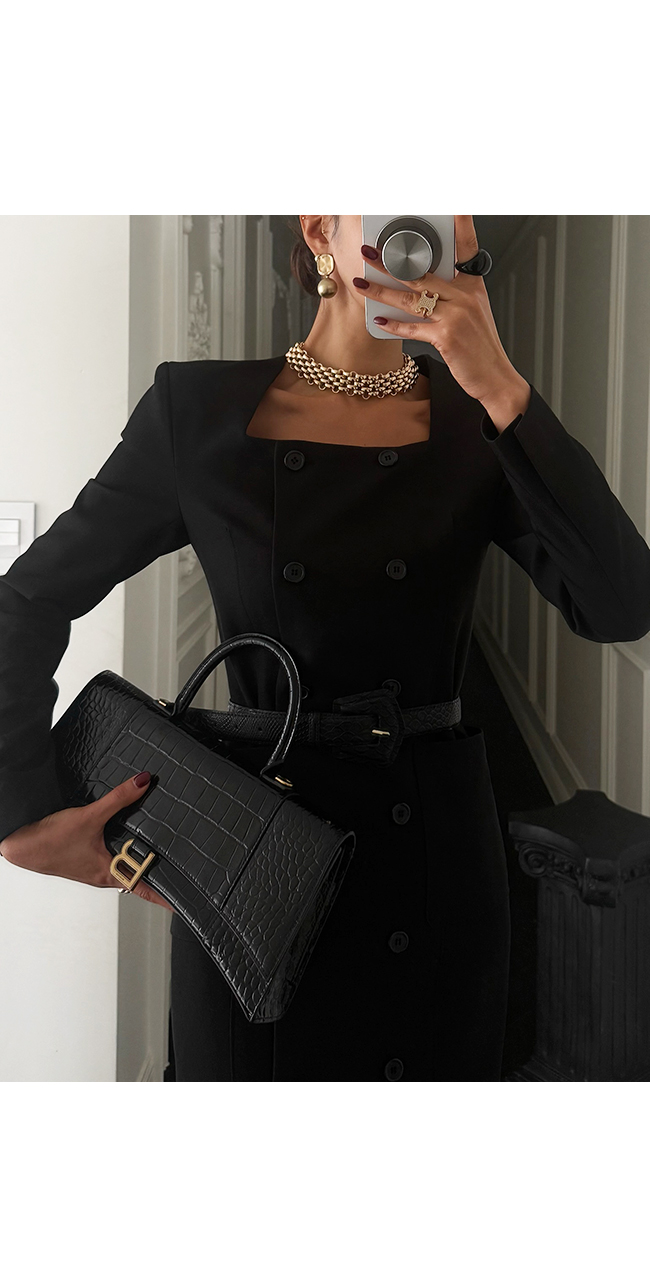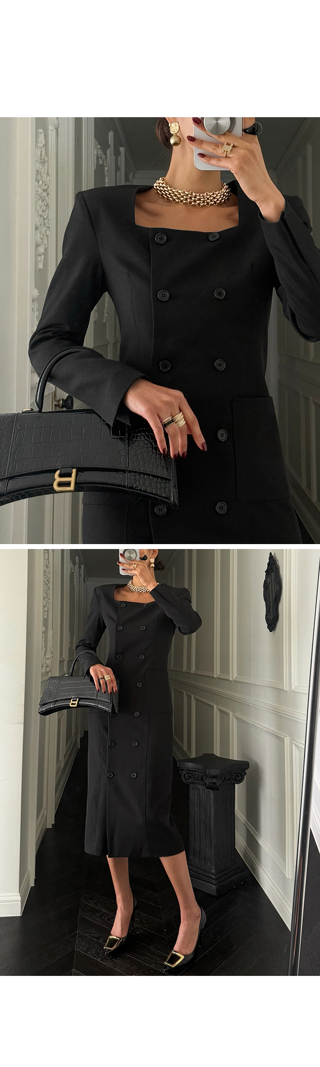 깔끔한 스퀘어 넥 라인과 더블 버튼 디테일이
