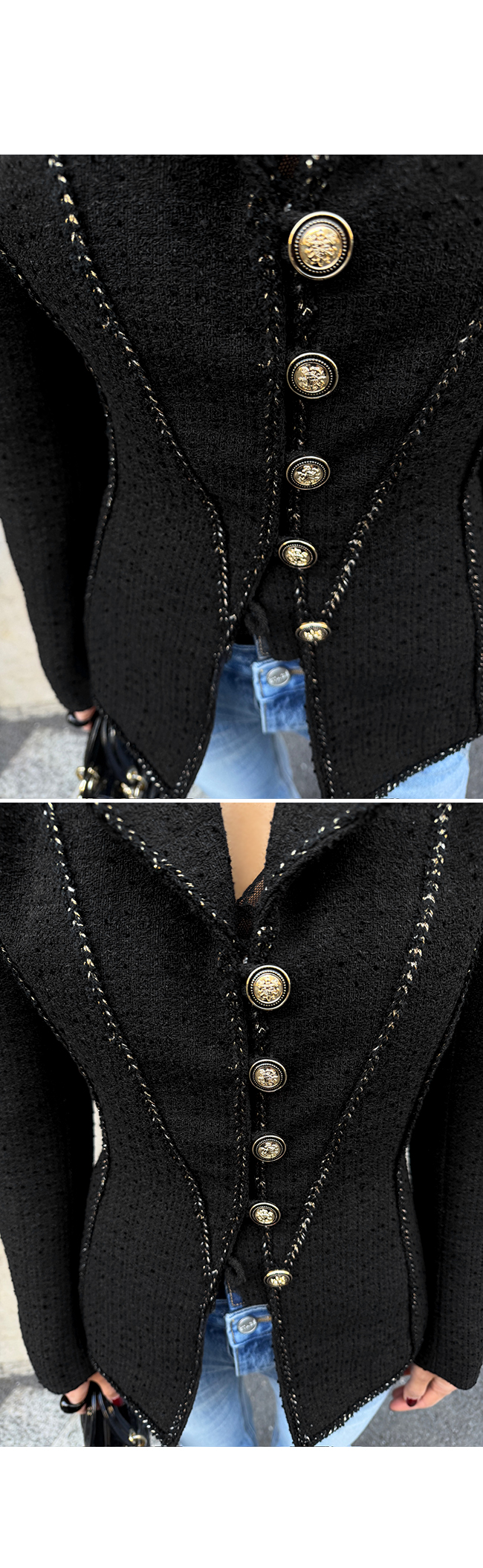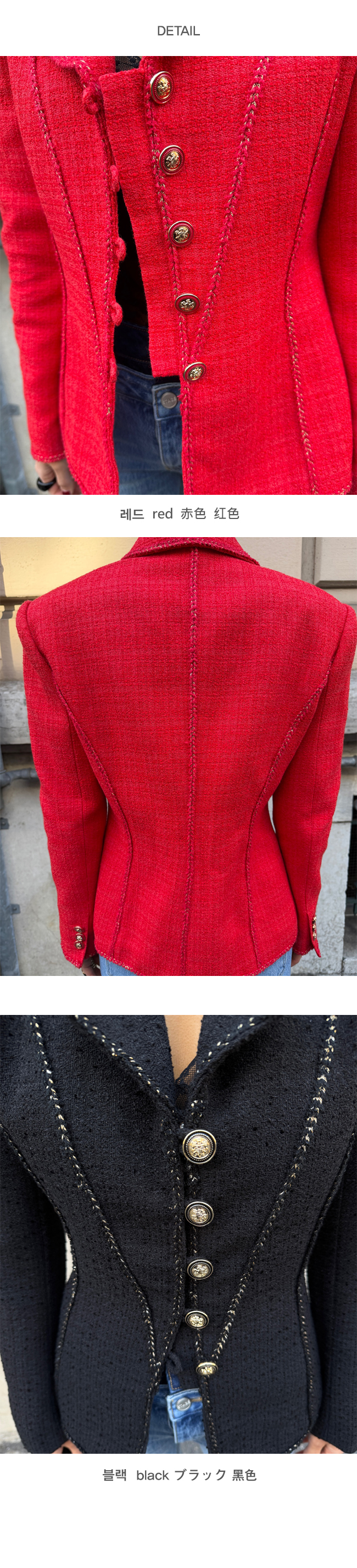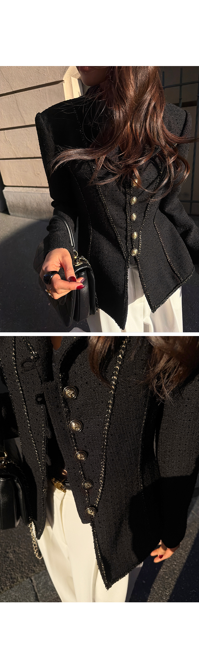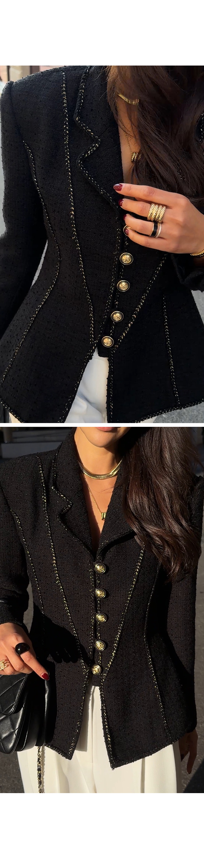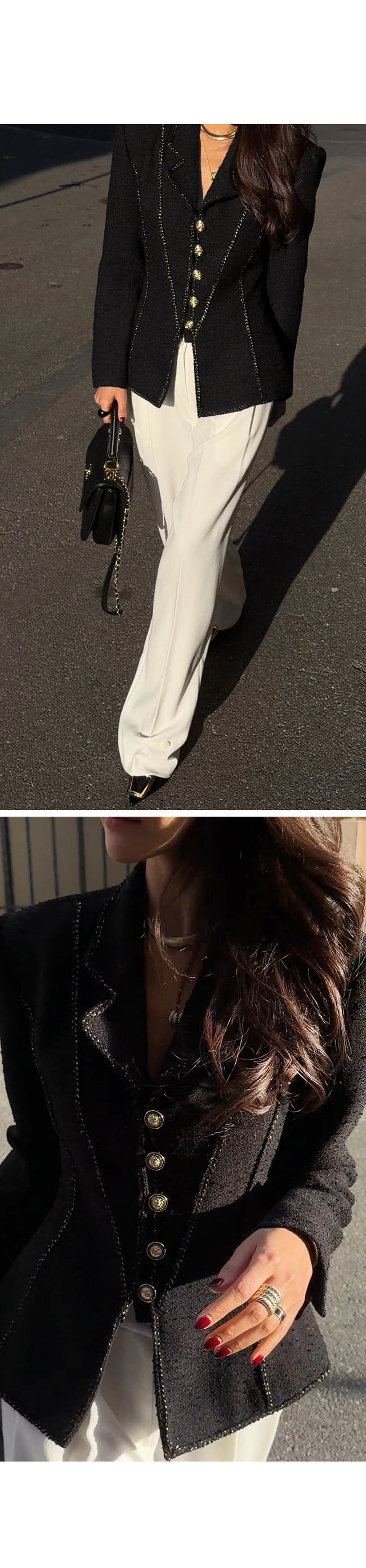 전체적으로 더해진 골드 스티치 디테일이 자켓의 라인을 따라 들어가