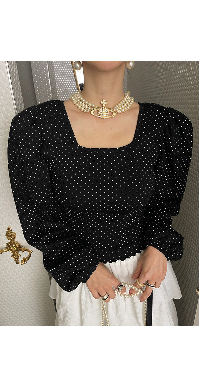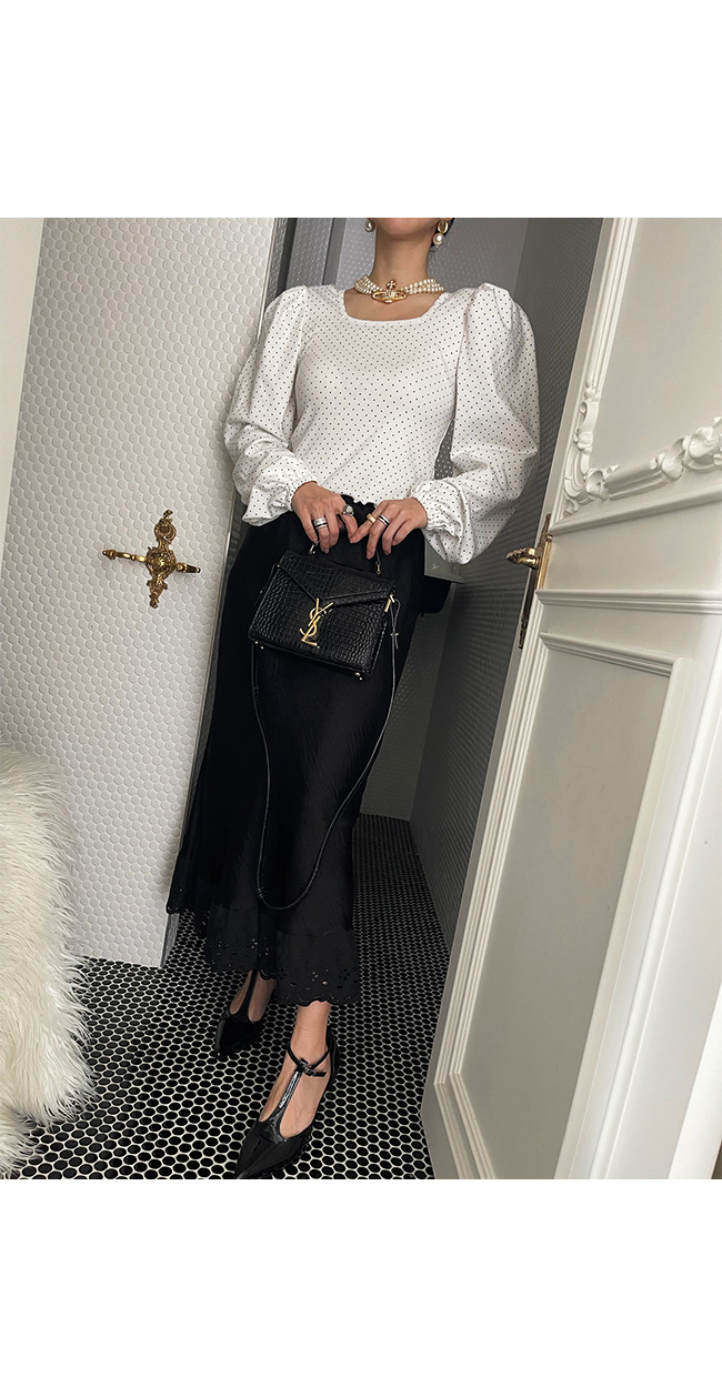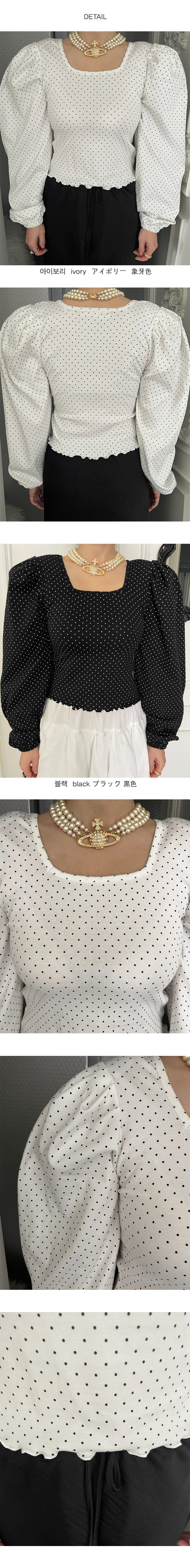 어깨 부분에는 볼륨감 있는 퍼프 소매가 더해져