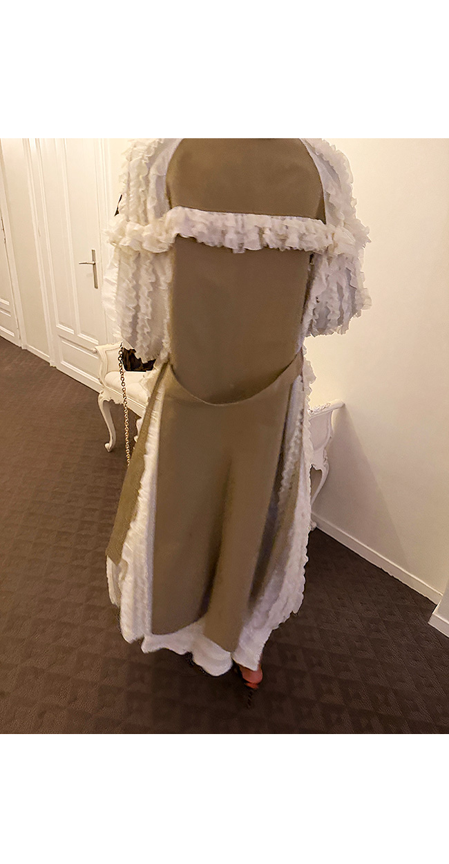 양 사이드와 소매, 백라인에 풍성한 프릴 디테일을 더해