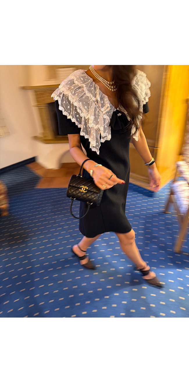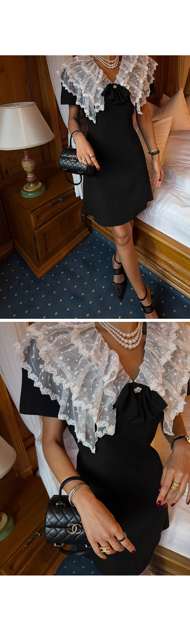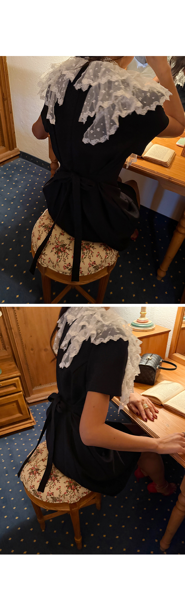 넥라인에는 풍성하게 더해진 레이스 빅 카라 디테일로