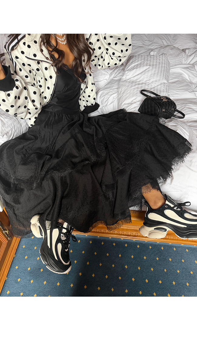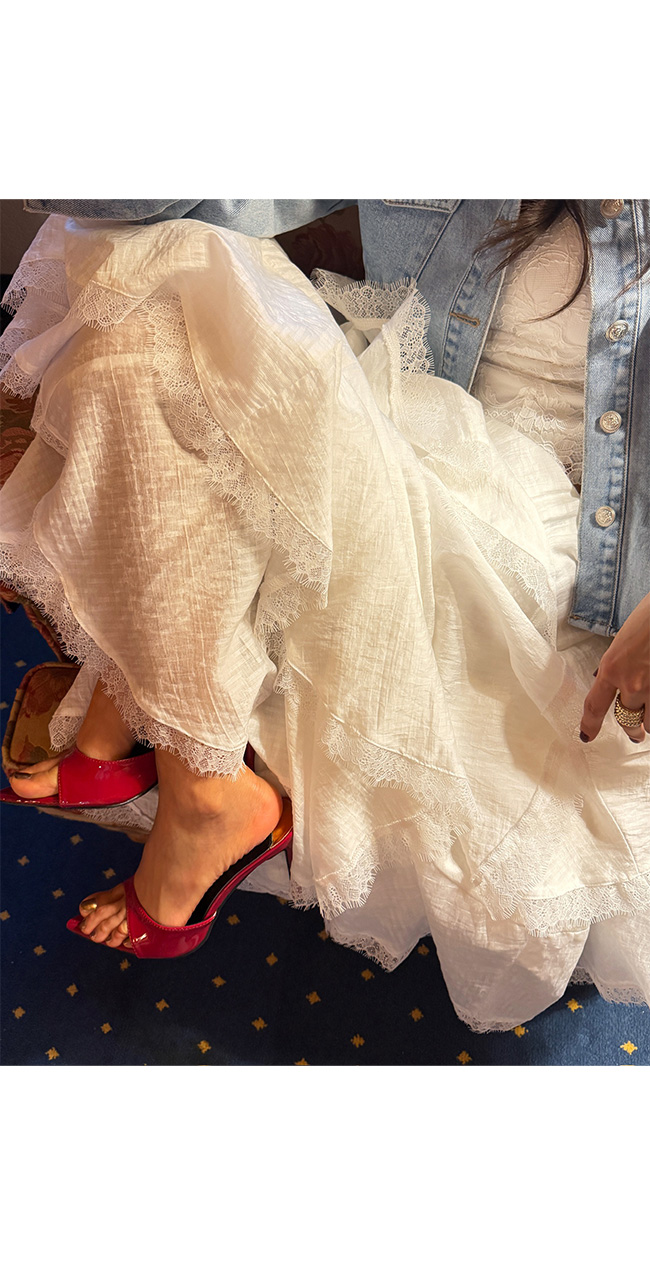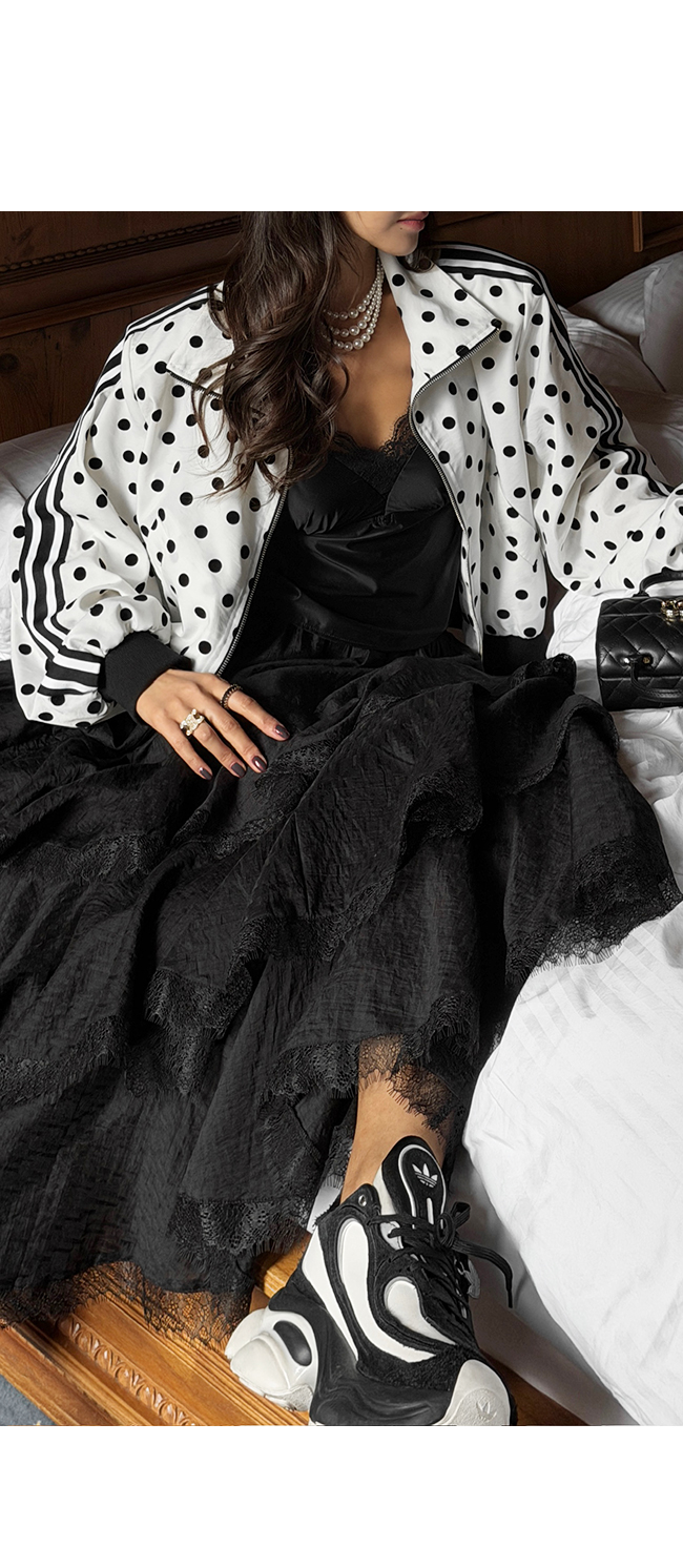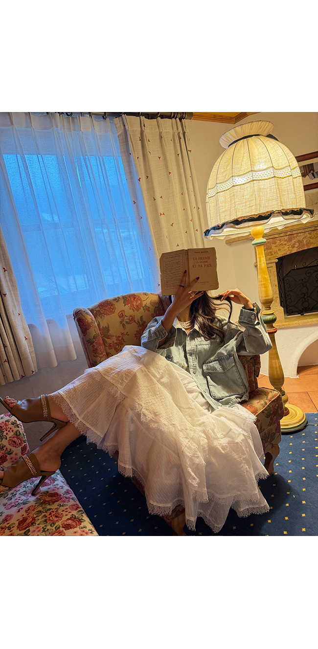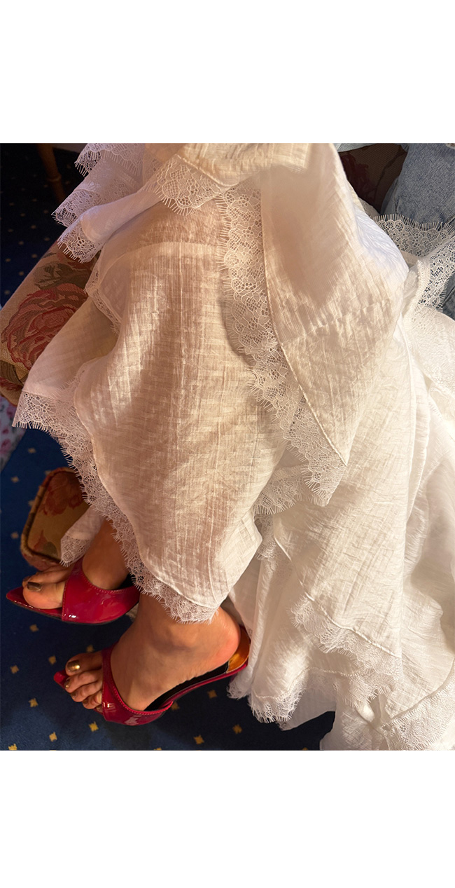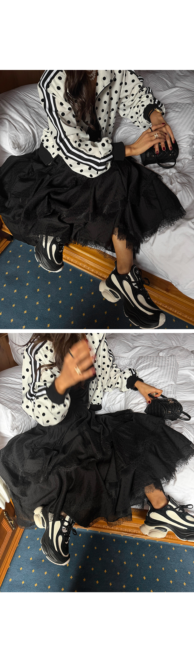 단마다 더해진 프릴 디테일과 레이스 마감이