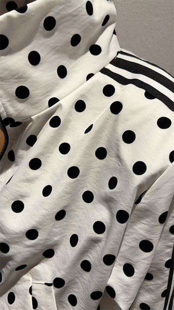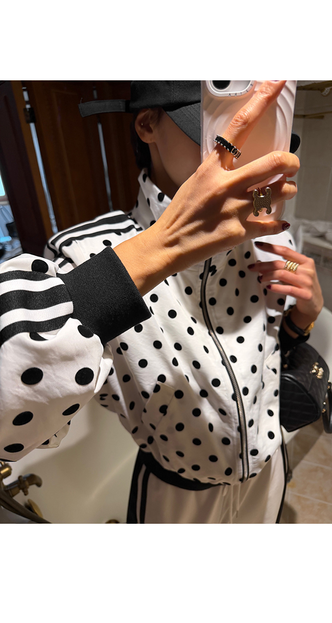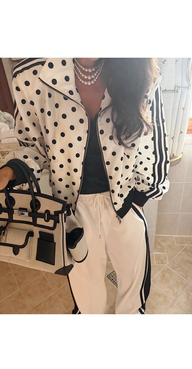 숄더와 소매 라인에 더해진 배색 스트라이프 디테일이